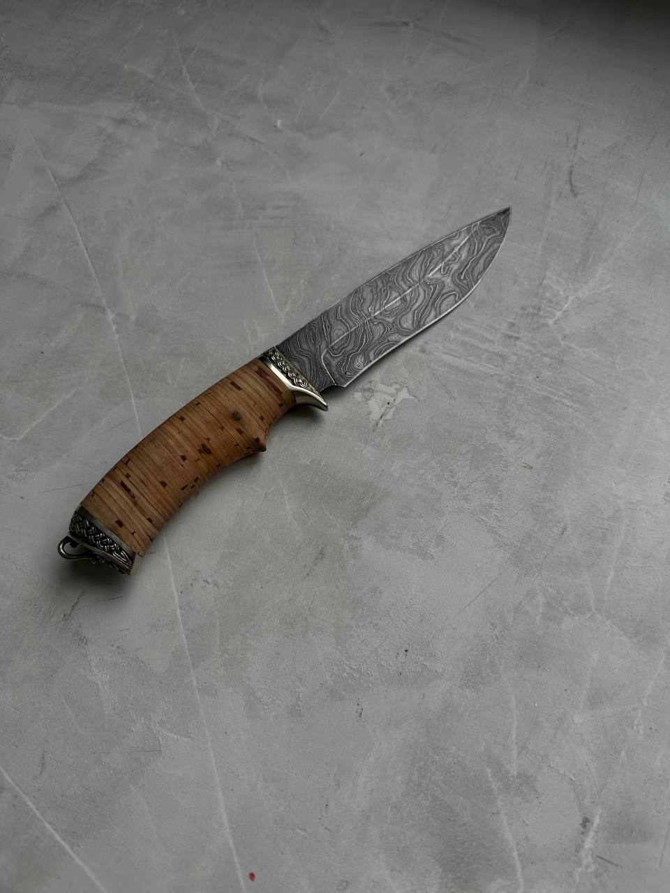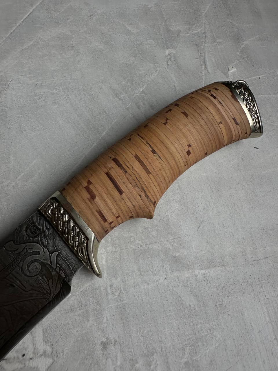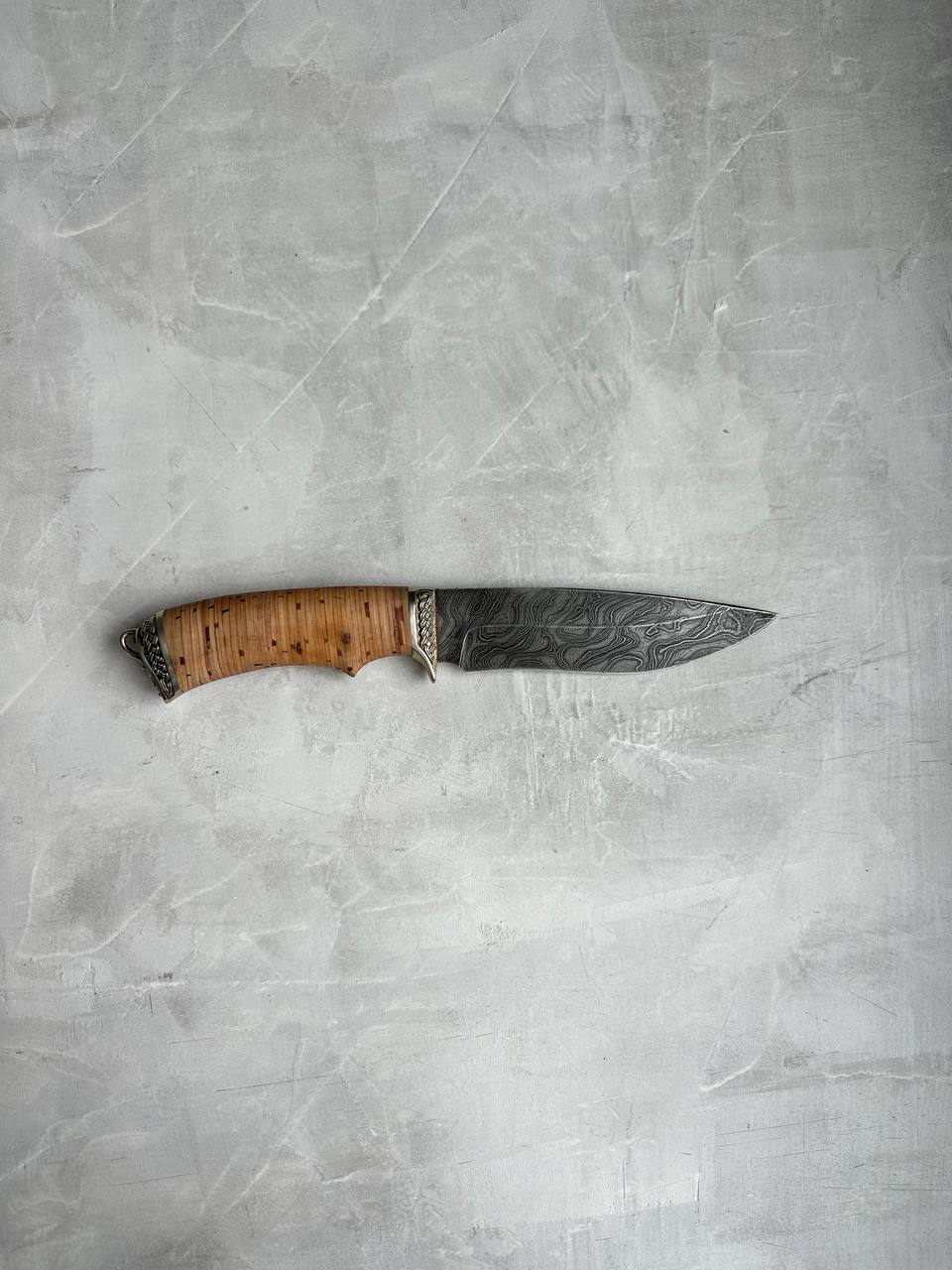 1. Нож из дамасской стали с гравировкой «Близнец», рукоять береста
