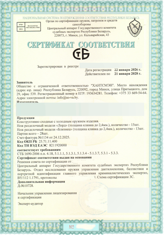 Нож «Близнец» конструктивно схожи с холодным оружием не является таковым. Соответствует требованиям технических нормативных правовых актов СТБ 1690-2006, СТБ 1320-2002 и криминалистическим требованиям.