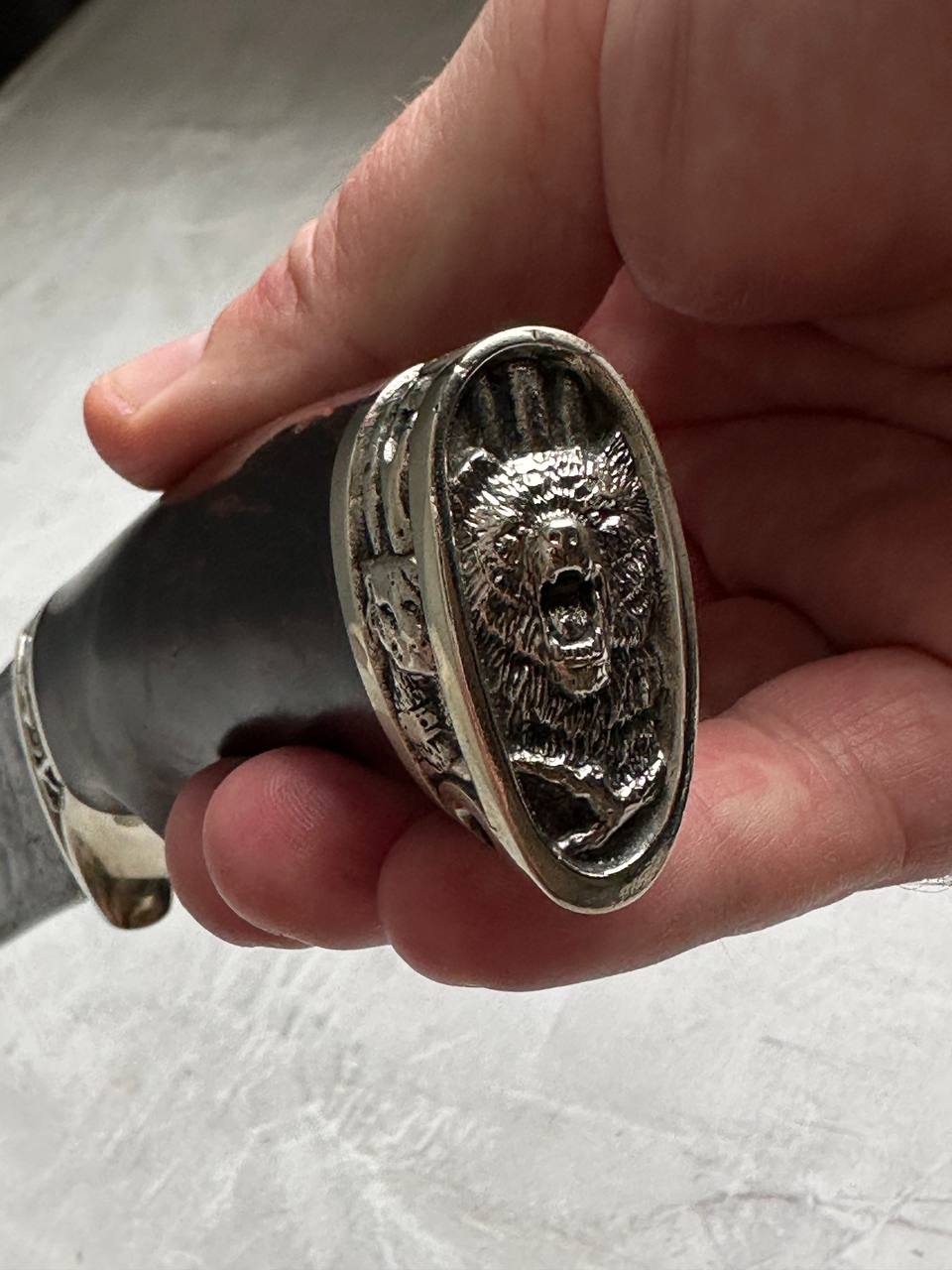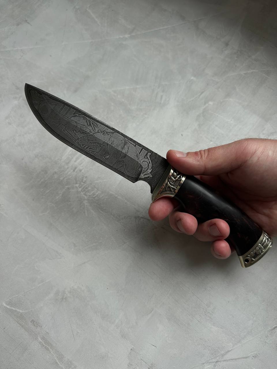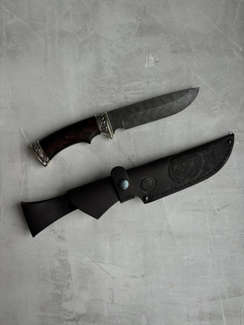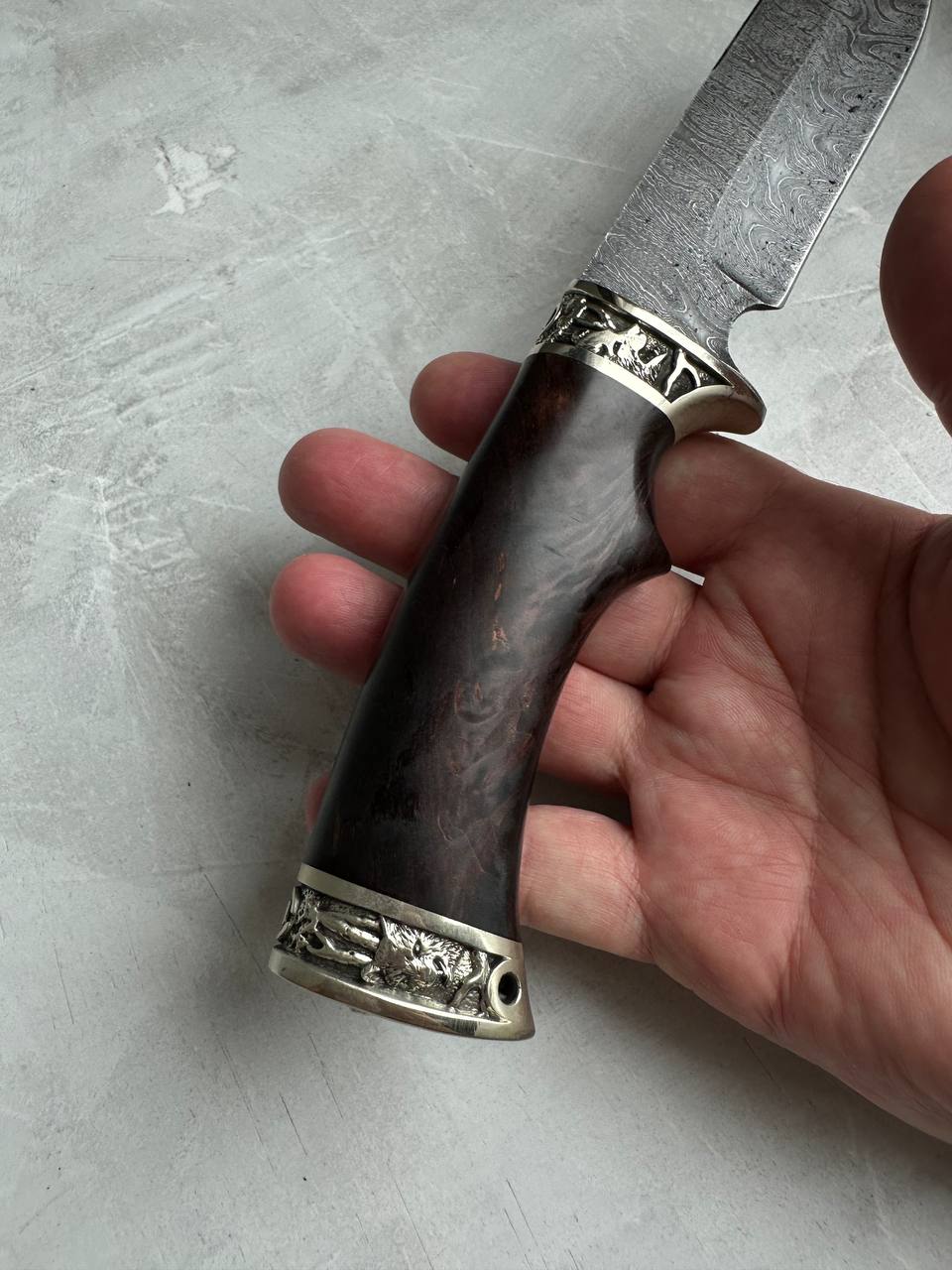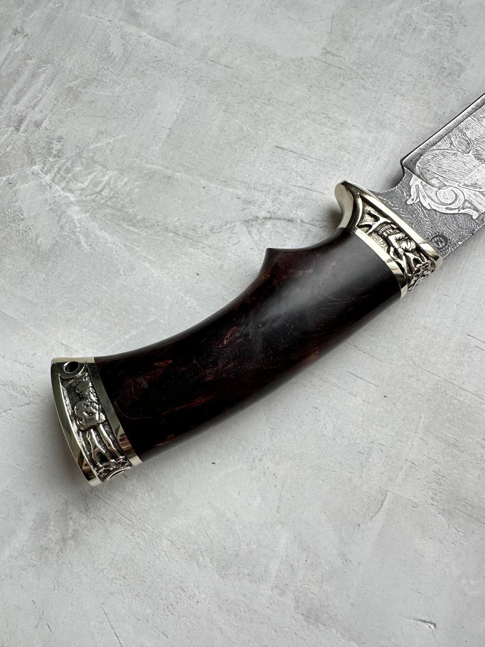 1. Нож из дамасской стали с гравировкой «Лорд», литье "охота", с рукоятью из карельской березы.