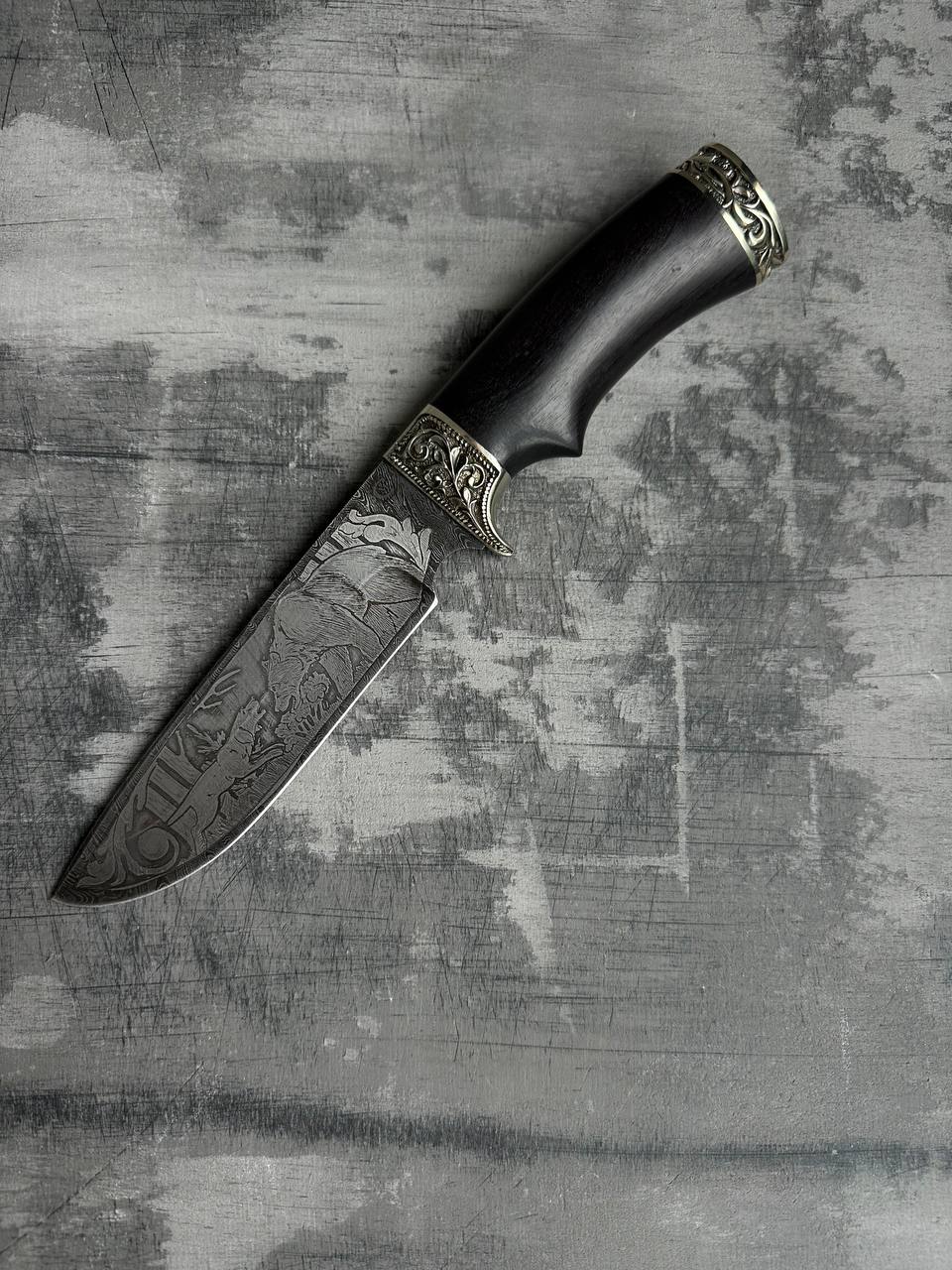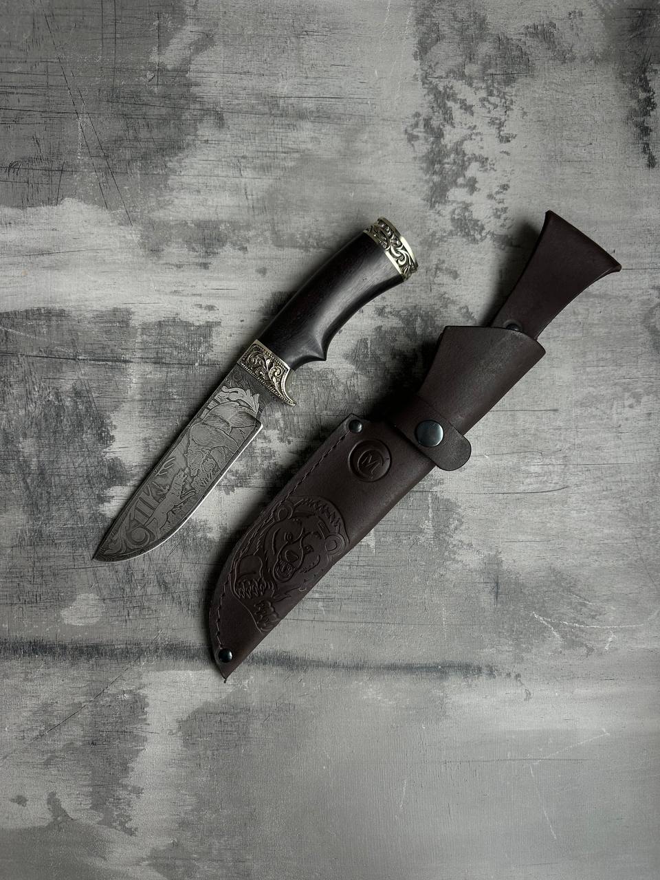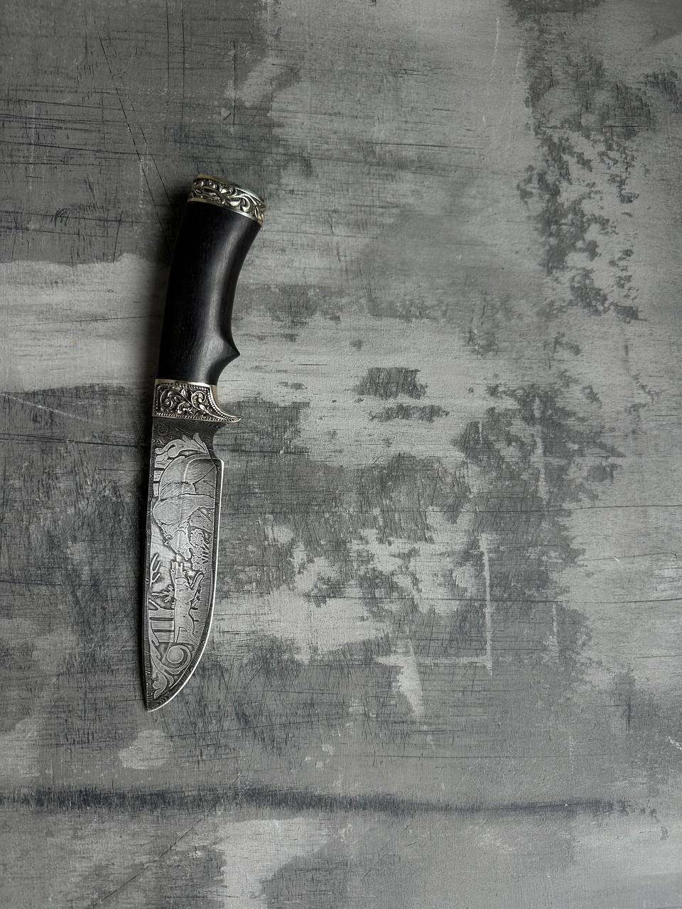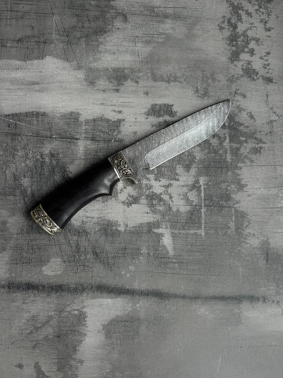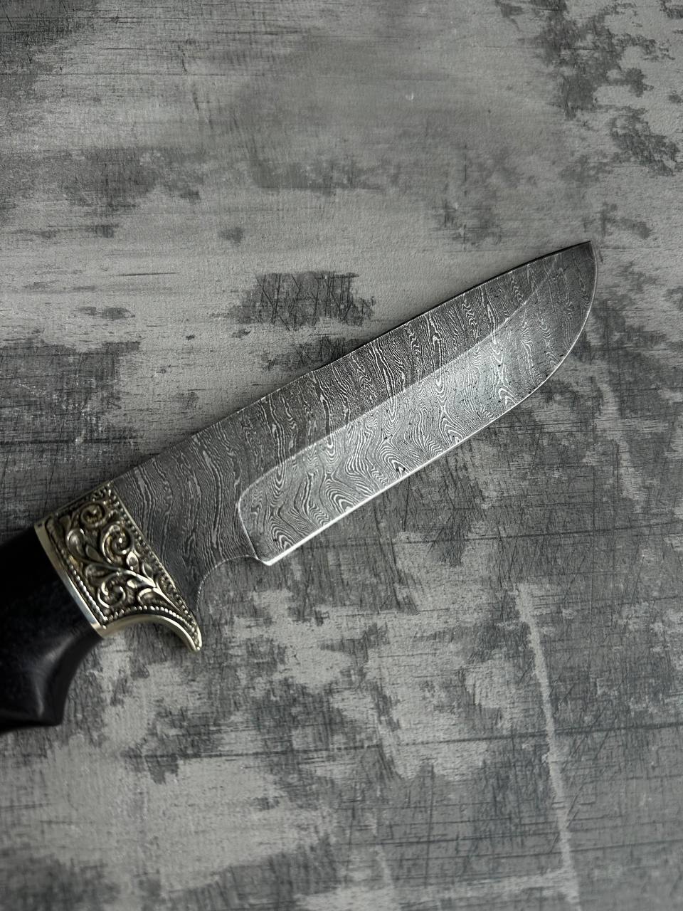 1. Охотничий нож из дамасской стали с гравировкой «Лорд», рукоять черное дерево