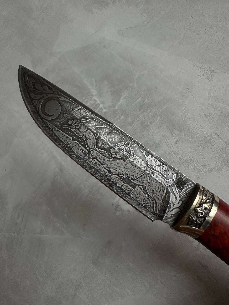 Нож из дамасской стали с гравировкой "Соболь", рукоять стабилизированная карельская береза изготовлен вручную. При изготовлении клинка использовалась дамасская сталь с твердостью 59 - 62 HRC, а при производстве рукоятки используется литье мельхиор, карельская береза.
